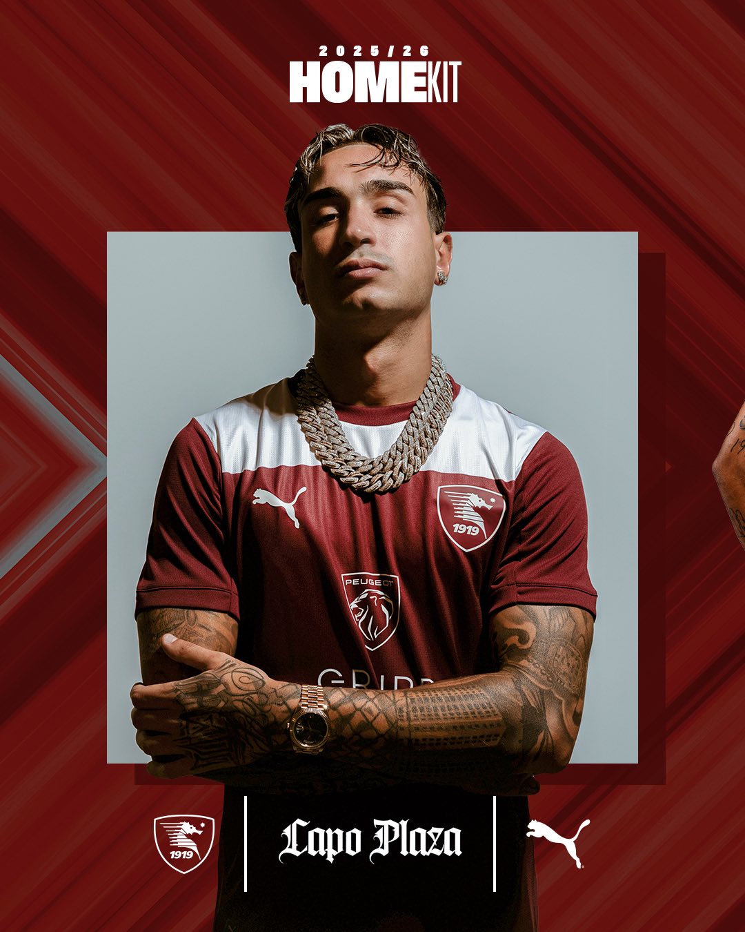 E’ finita l’attesa, la Salernitana ha annunciato la prima maglia che indosseranno i granata nel corso della stagione. Il testimonial della nuova maglietta firmata Puma è Capo Plaza. Il noto trapper nato a Salerno aveva già indossato nel corso del concerto del 12 agosto a Piazza della Libertà la tuta ufficiale dell’ippocampo (clicca qui per sapere di più).